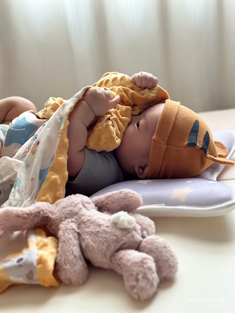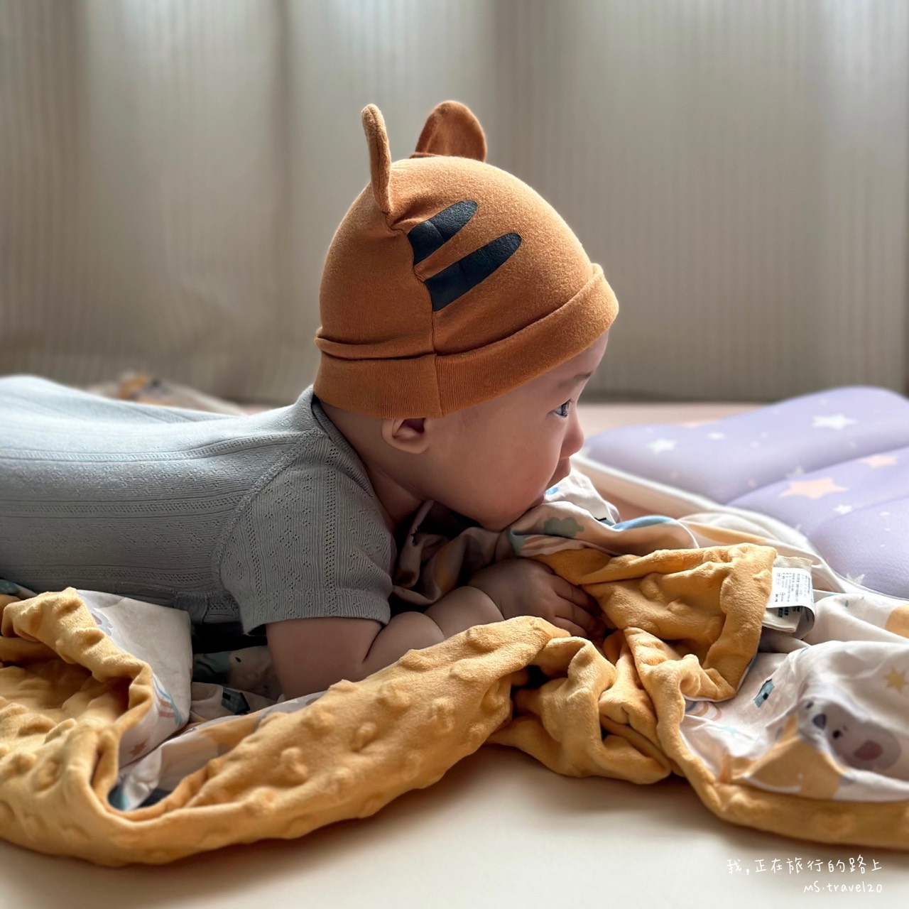 現在小手開始會抓握後,會一直拉蓋輕盈的小被被來玩耍,大人記得要陪同,以防寶寶不小心蓋到口鼻喔。