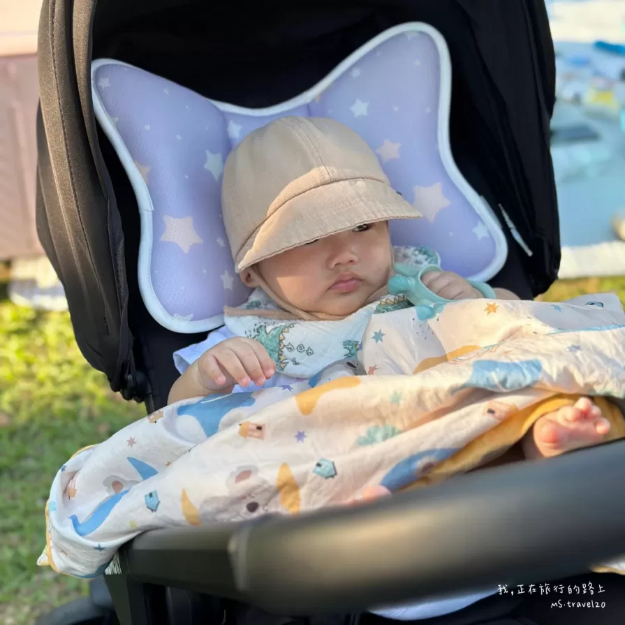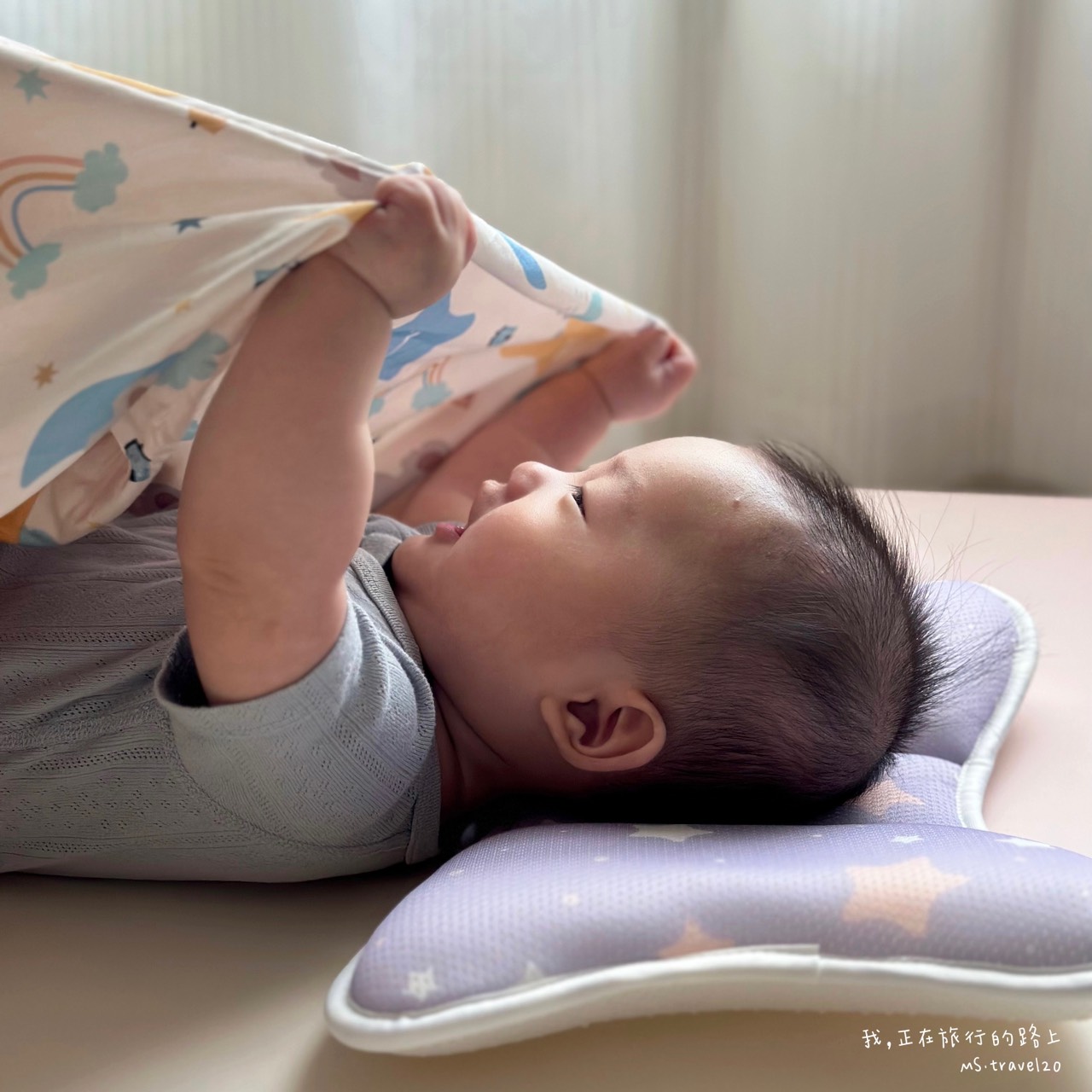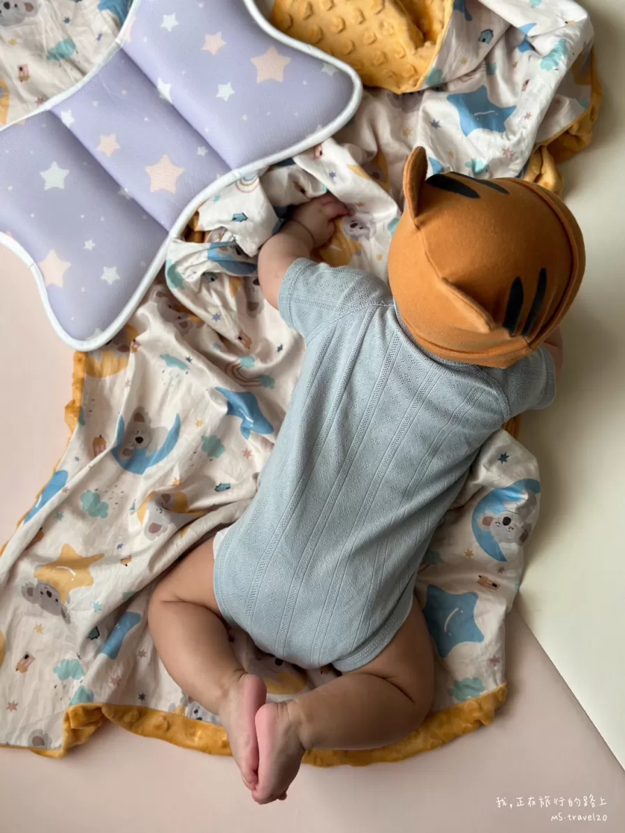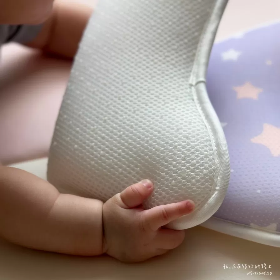 在頭下放這塊護頸枕,讓桑寶儘可能不因搖晃而碰撞小腦袋,平時在地墊上玩耍也會讓桑寶當小躺枕來使用呦~