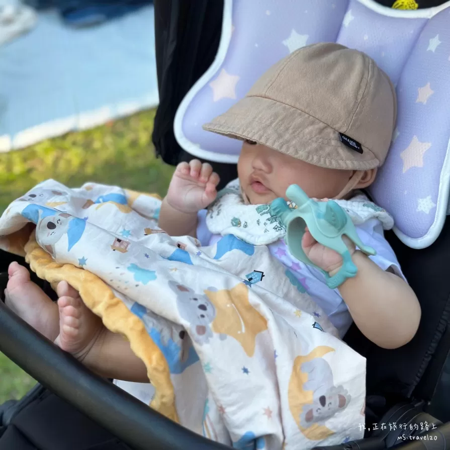 ღ 哇!你看是動物園裡面的無尾熊,好可愛哦~桑寶就開始目不轉睛的一直看著安撫毯上的可愛圖樣,新鮮的感到好奇,現在小手開始會抓握後,會一直拉蓋輕盈的小被被來玩耍