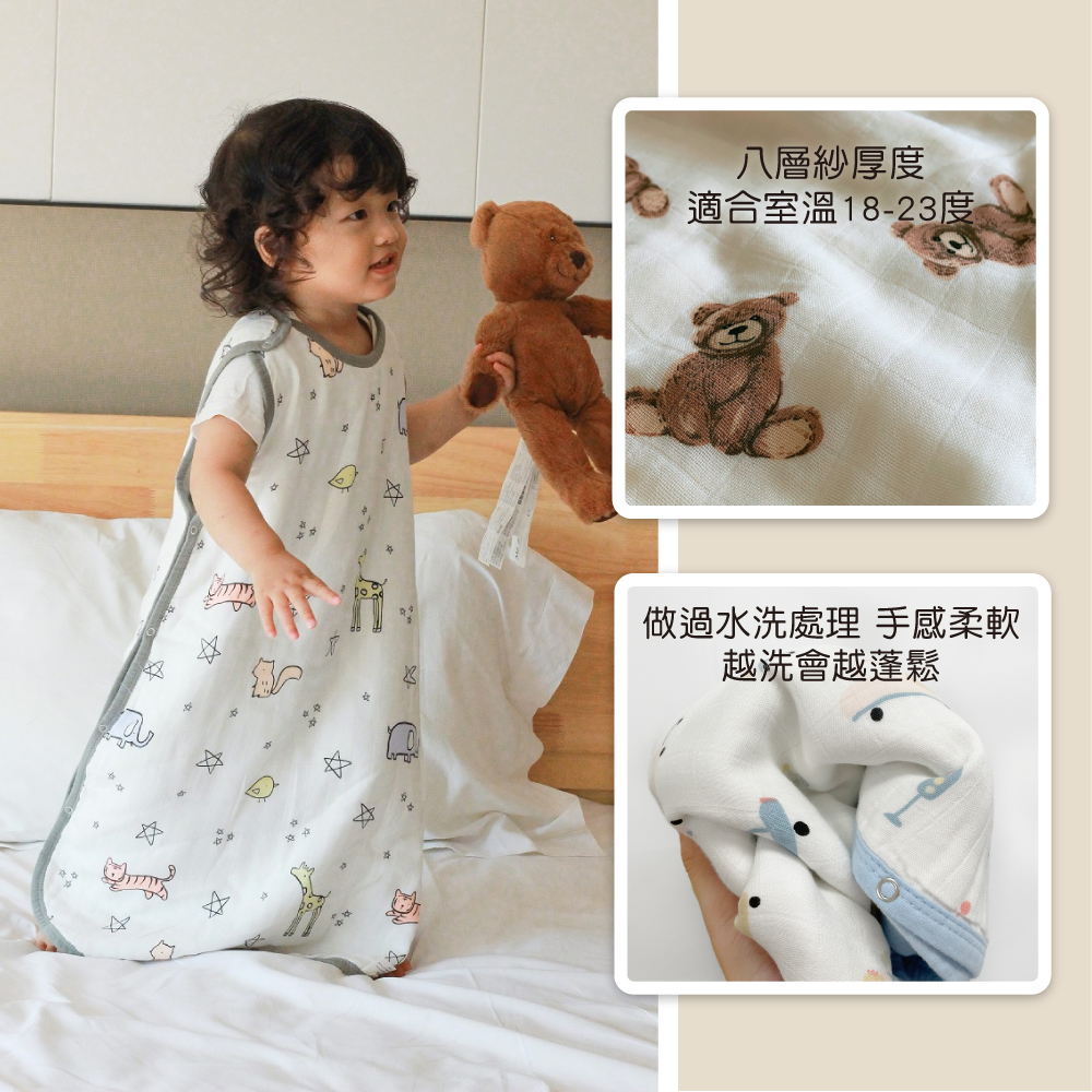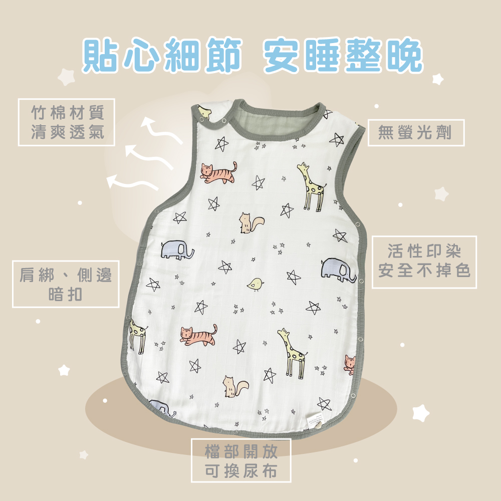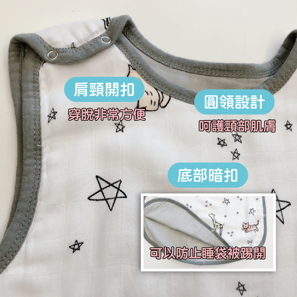 ✓ 設計巧思:背心式設計,單邊肩膀、雙側邊暗扣、底部防踢扣,穿脫輕鬆無負擔,讓寶寶不再因為踢被而驚醒。