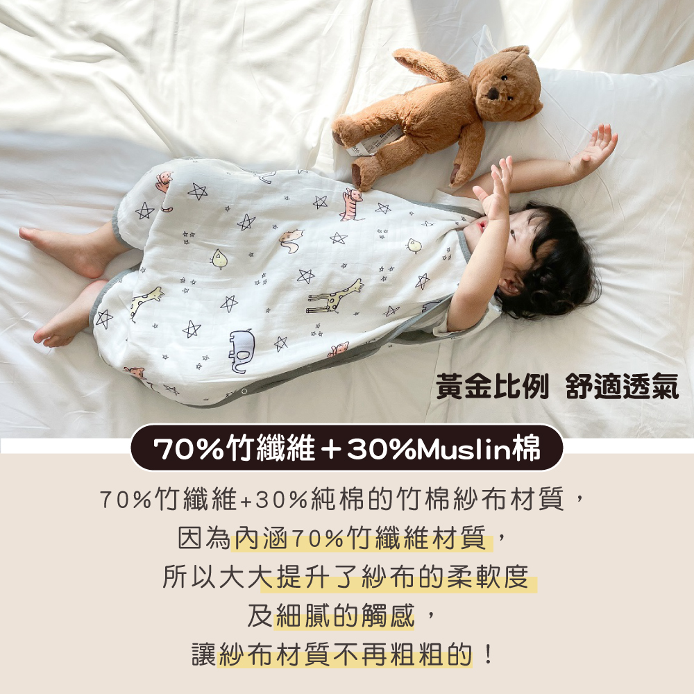 70%竹纖維+30%muslin棉的黃金比例,從材質到織法都是高水準,竹纖維親膚吸水性強,柔軟舒適有韌性,竹纖維混棉後既有竹纖維的滑順感,又具有棉的舒適透氣,觸感棉柔質地輕盈,如同會呼吸的面料可保持空氣流通,隨環境溫度自然調節寶寶體溫避免過熱,減少傳統棉質衣物厚重悶熱帶來的不適!