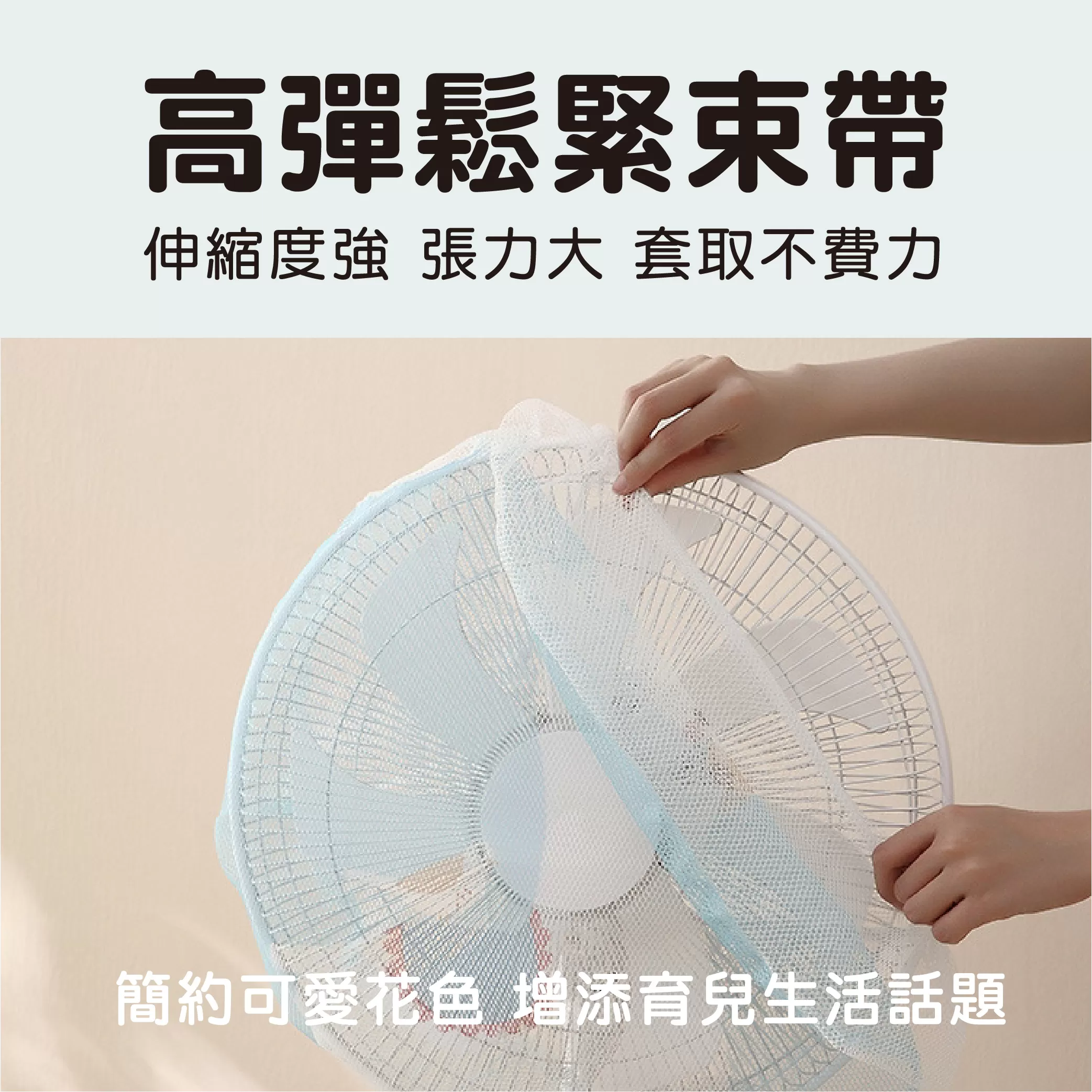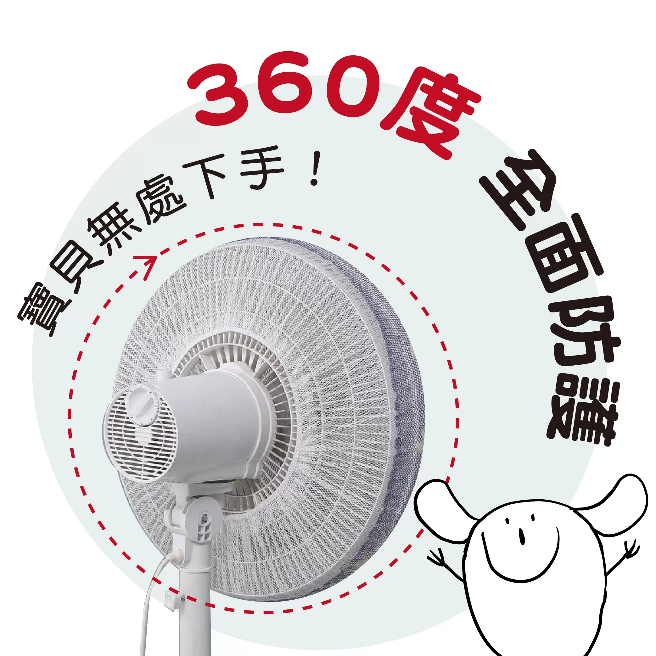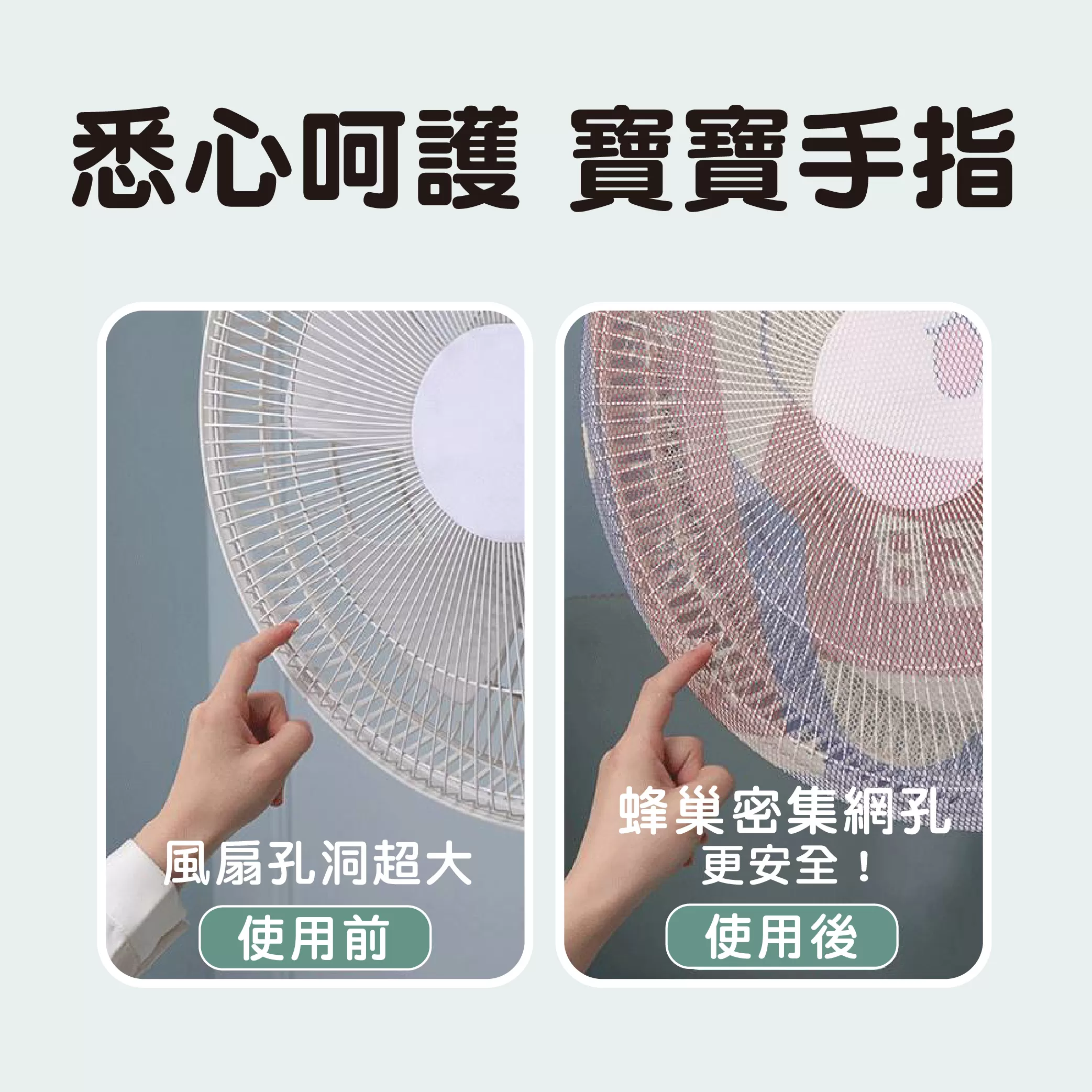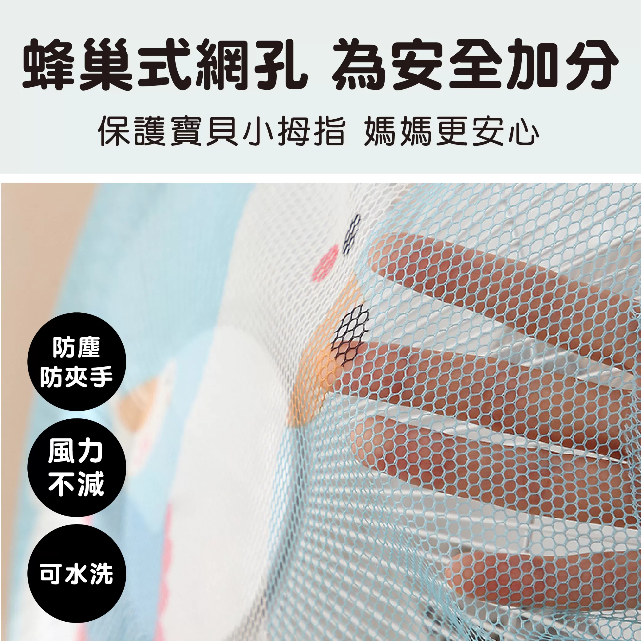 ✓ 全包覆式設計完整罩住電風扇的大空隙,防止寶寶將手指伸進風扇中而發生意外,保護寶寶手指