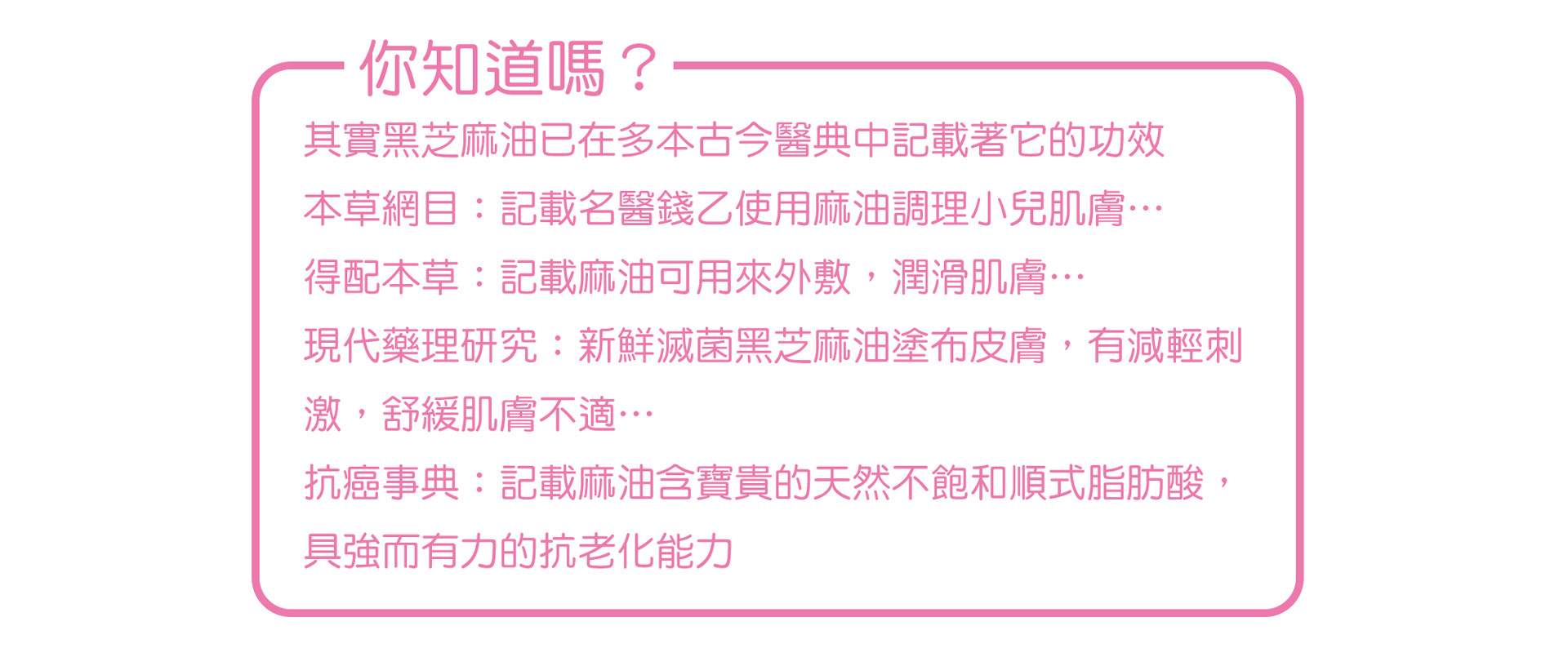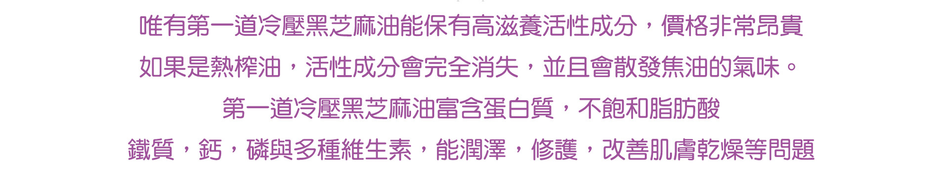 ✓ 採用第一道冷壓黑芝麻油與高品質原料,協助肌膚扺抗外來的侵襲,提升肌膚防禦力
