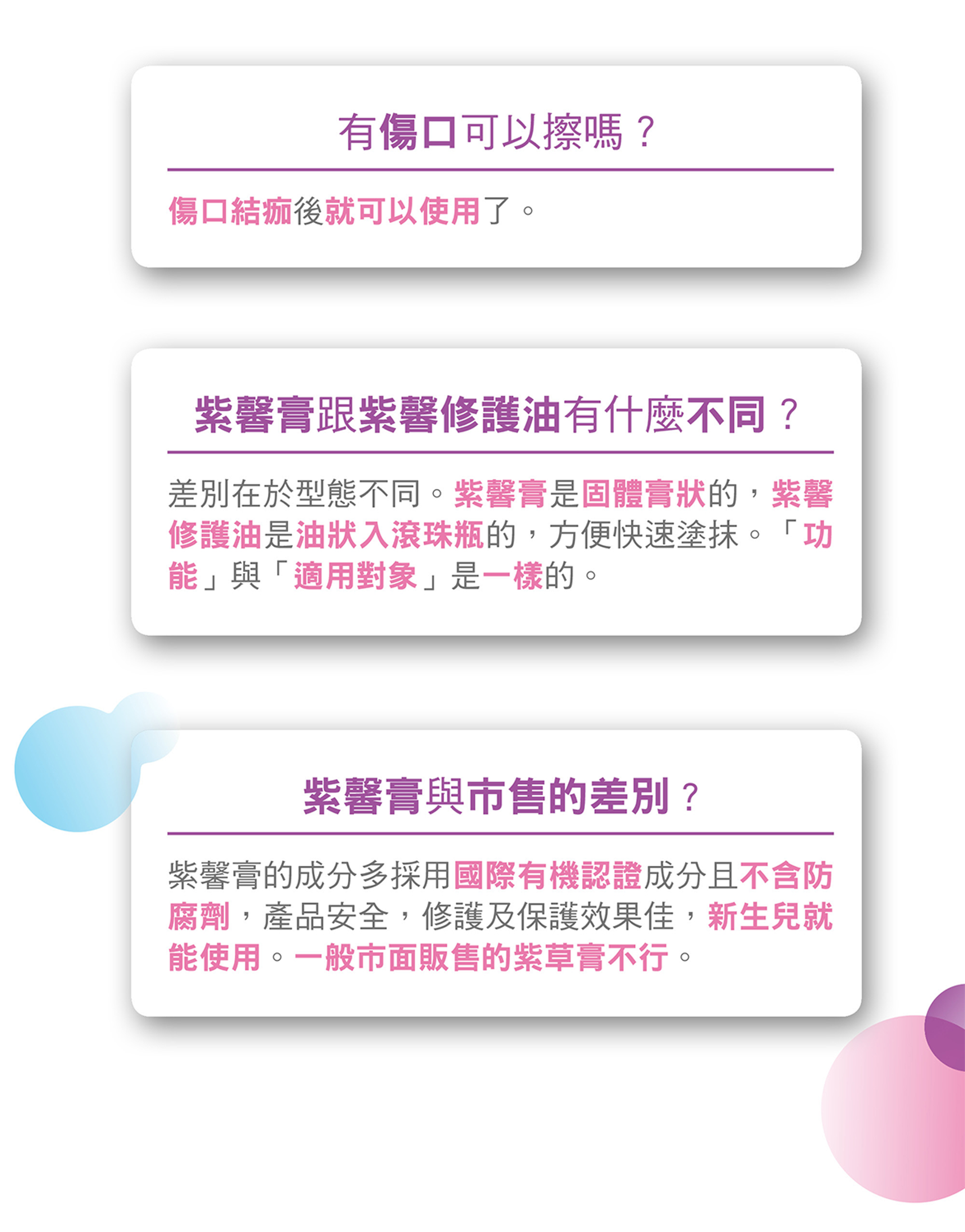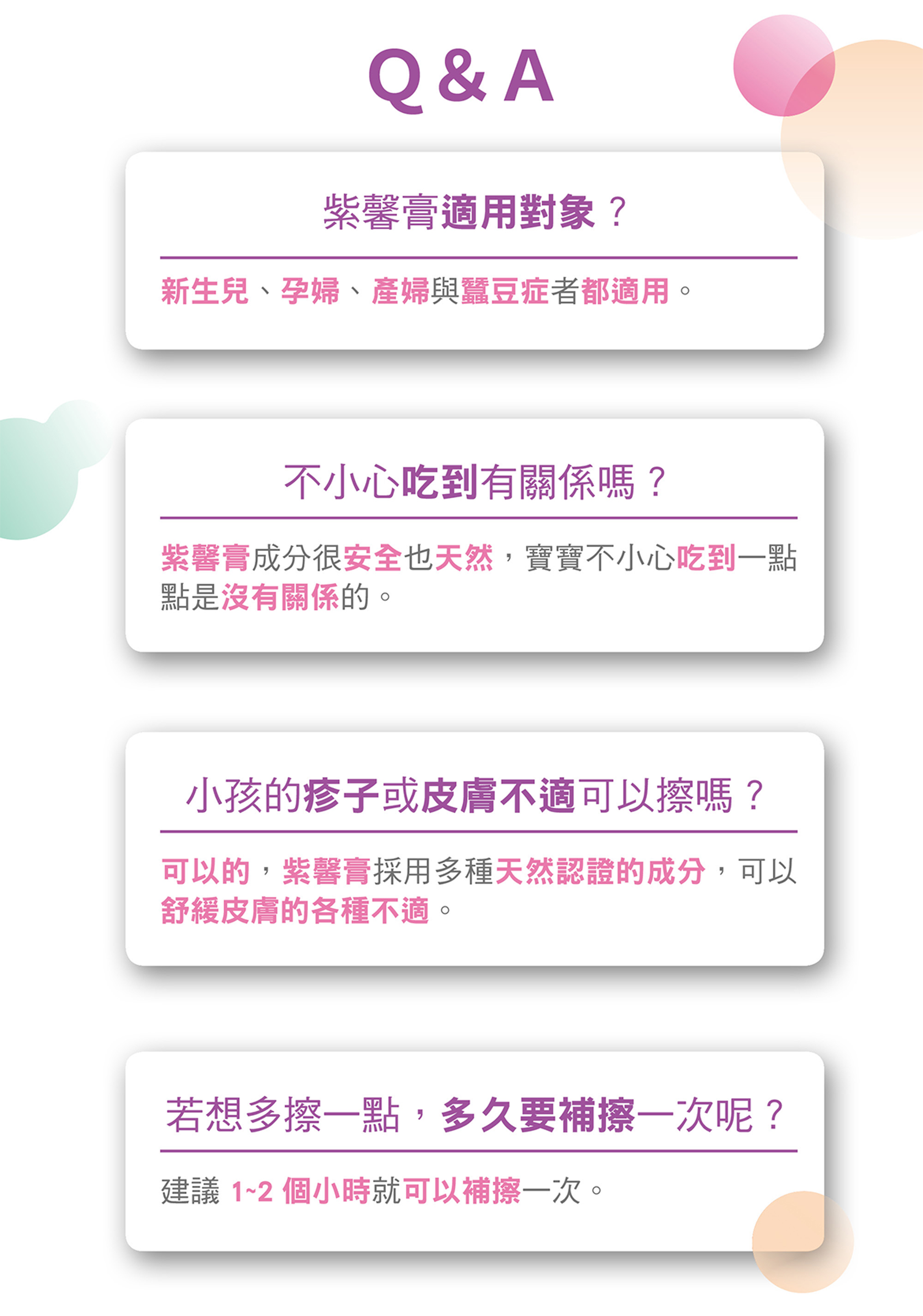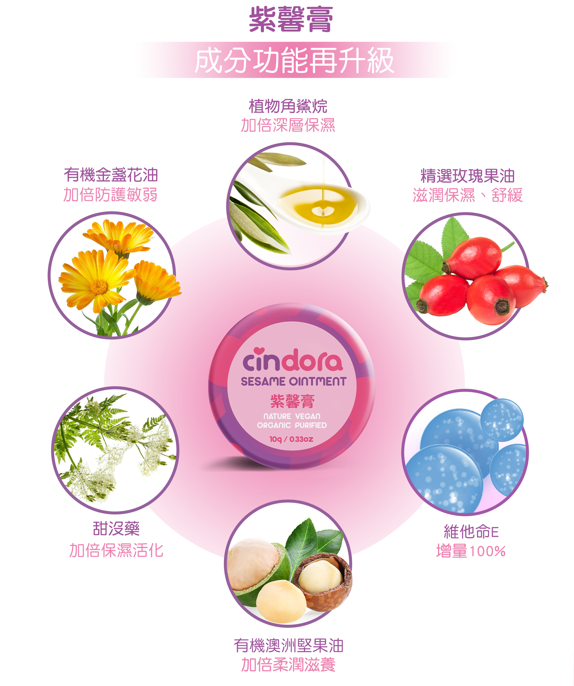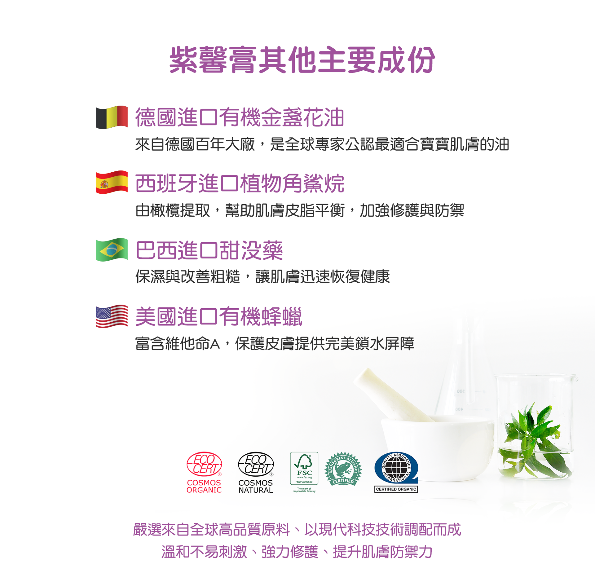 新版紫馨膏提升了黑芝麻油的比例,成分功能、觸感、修護潤澤效果再升級!國內最大月子餐品牌「紫金堂」指定聯名商品!隨時照顧全家人的肌膚,媽媽包裡不可或缺的法寶。