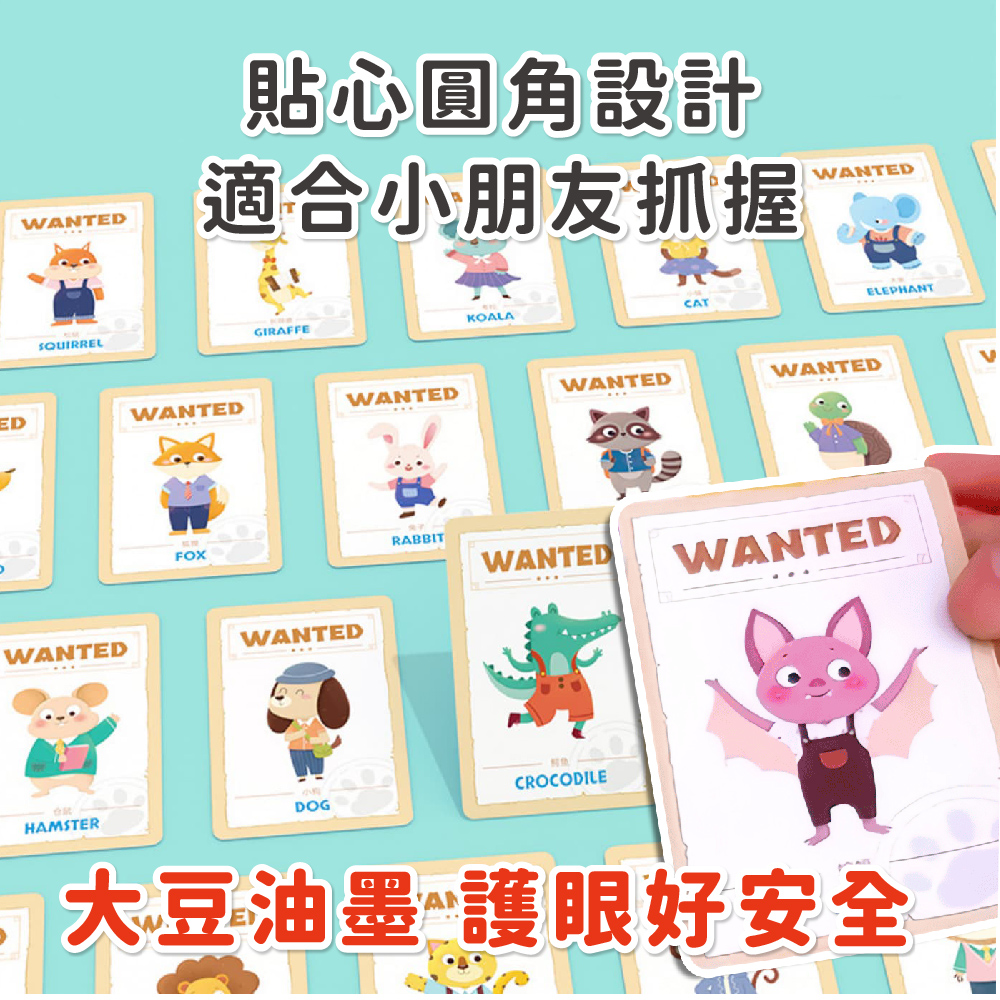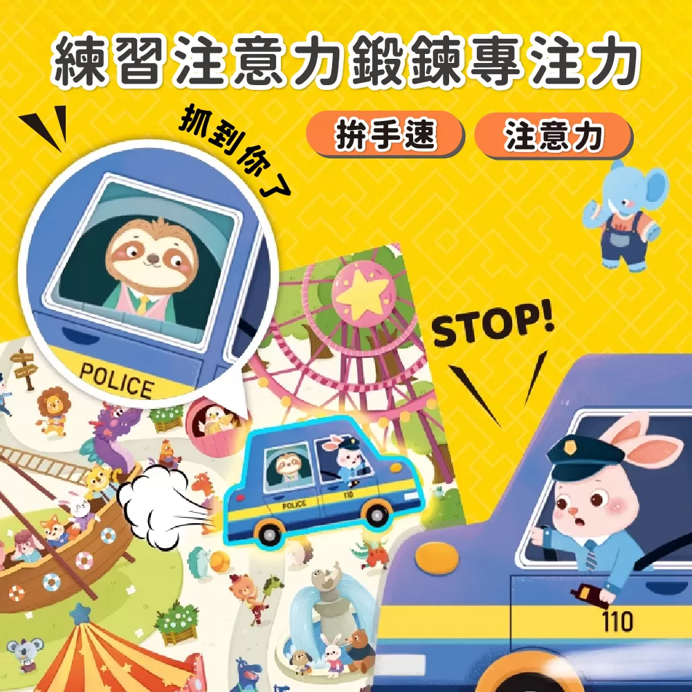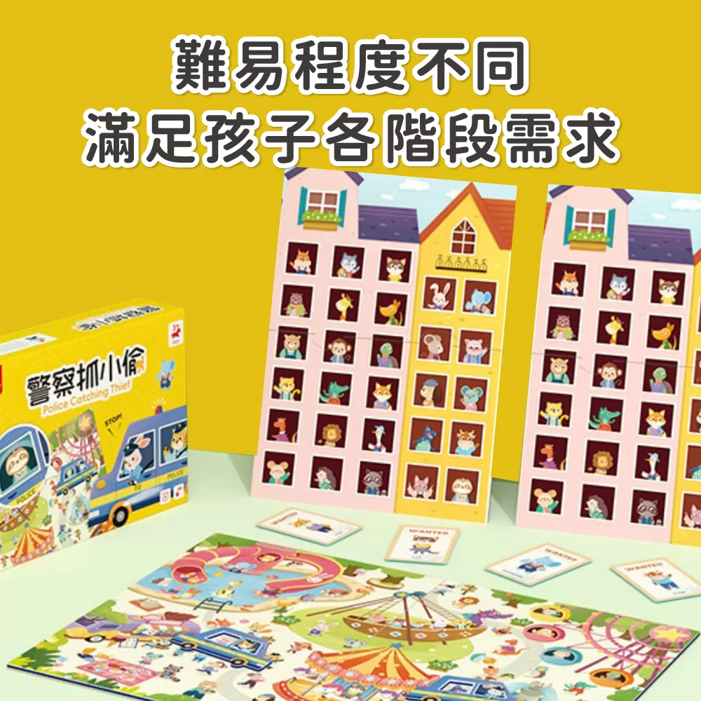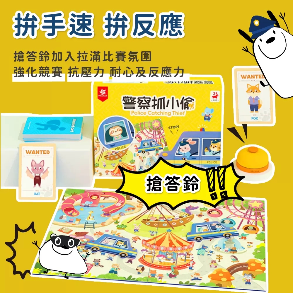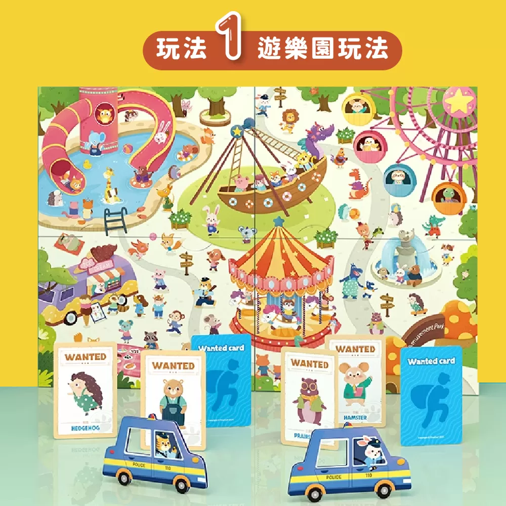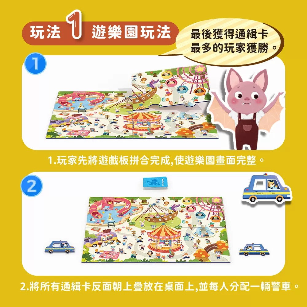 ✓ 玩法一(遊樂園玩法):翻開一張通緝卡,兩位玩家在遊樂園中找到小偷影像後將警車鏤空處套在小偷頭上並按響鈴,正確可得到該通緝卡,卡片最多者獲勝!