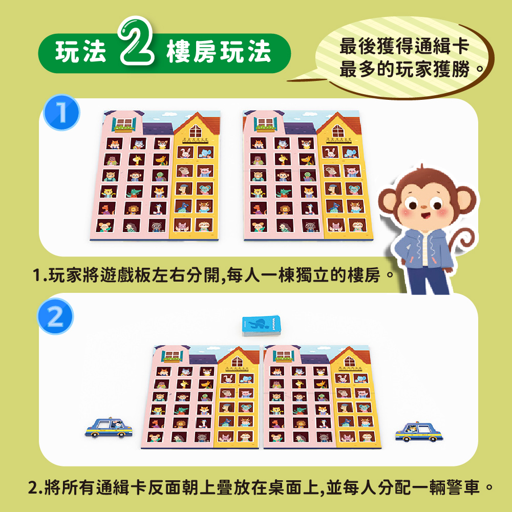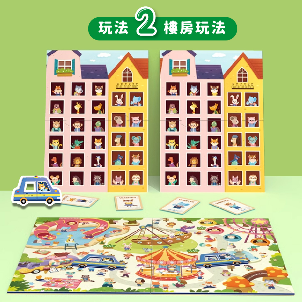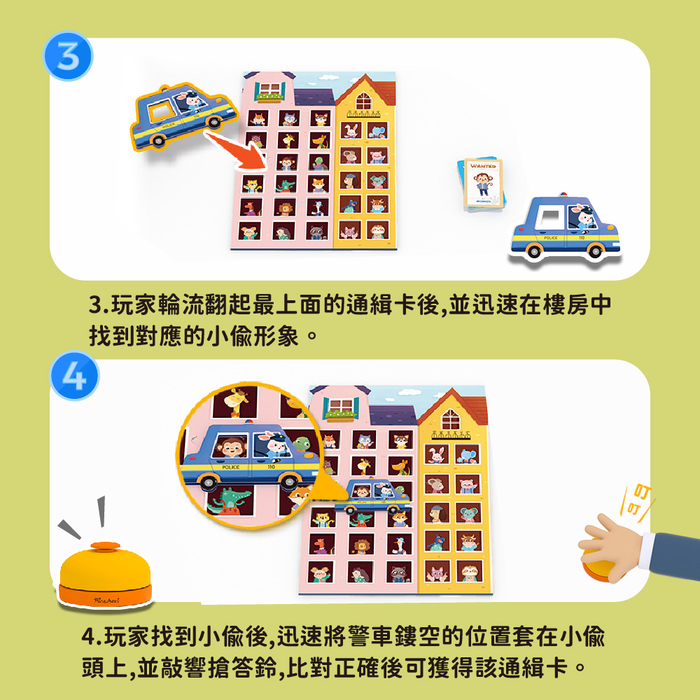 ✓ 玩法二(樓房玩法):玩家將遊戲板左右分開,每人一棟獨立的樓房,翻開一張通緝卡,兩位玩家在樓房中找到小偷影像後將警車鏤空處套在小偷頭上並按響鈴,正確可得到該通緝卡,卡片最多者獲勝!