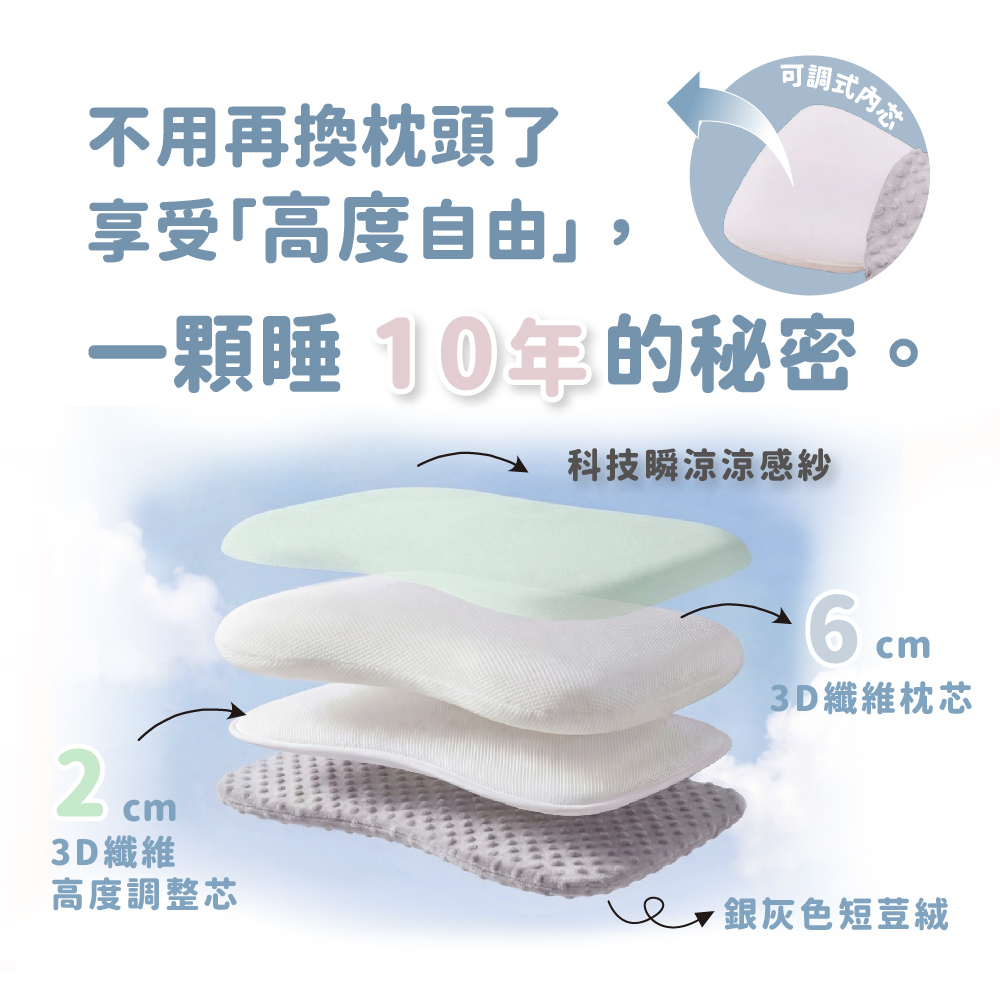 :枕芯包含 2cm 嬰幼兒薄墊與 6cm 幼童厚枕,可單獨或疊加使用(2cm+6cm=8~9cm)。高度2cm 適合約0~3 歲以上幼童,6cm 適合 3~12 歲幼童,8cm 則適合12歲以上/大人使用。不用再隨年齡換枕頭,認枕頭也能無縫接軌享受「高度自由」,買一次前直接睡10年。