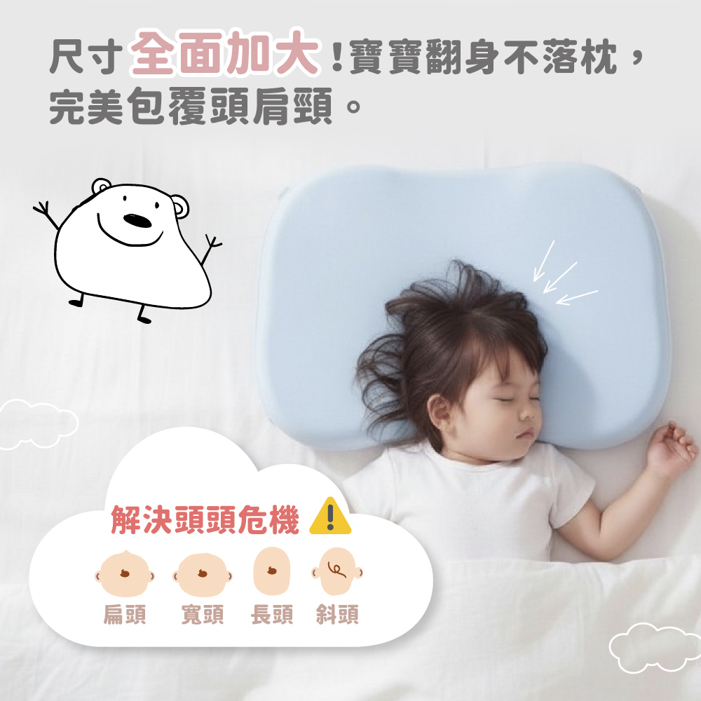 .尺寸全面加大,完美包覆肩頸:全新加大版型,符合科學護頸的人體工學設計,完美貼合嬰幼兒的肩部與頸部曲線。更寬廣的枕面讓寶寶睡覺翻身也不落枕,給予最安穩的支撐。
